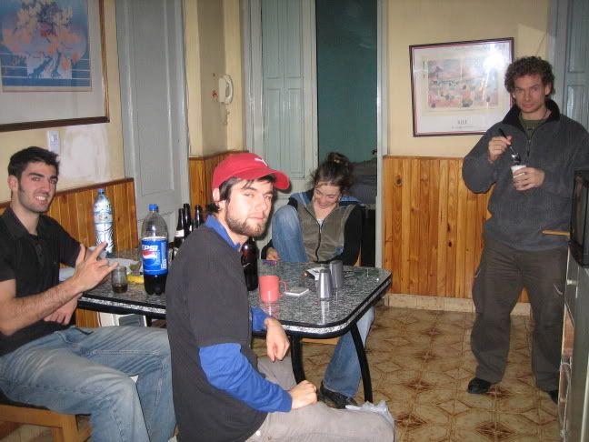 J'ai terminé en vous disant que j'etais a Montevideo, Uruguay (ATTENTION, ne pas lire U-R GUAY!!!), alors je vais continuer de la. On est arrivé lundi matin, ultra mort de notre nuit de bus et de la fin de semaine a BA. On avait un rendez vous avec Martin a 3h, alors on a èré dans la ville avec notre immense sac-a-dos. Comme je disais, la ville est magnifique. Beaucoup de "casa colonial", beaucoup d'arbre, des rues en inter-bloc, beaucoup de parcs, dont un qui longe la plage sur toute la ville. A 3h, on se rend chez Martin (a droite.......), qui est en fait la maison de sa blonde (a gauche), qui habite avec sa mère (centre gauche) et une des ses bonnes amies (qui etait ma foie tres jolie... au centre droit).