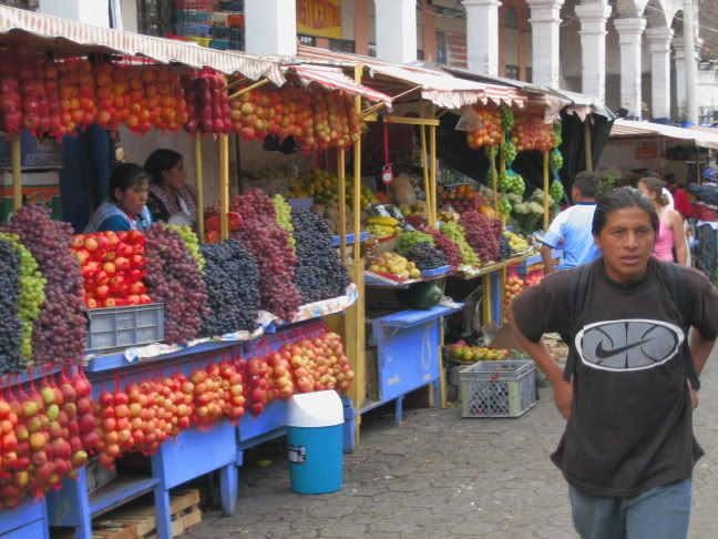 Après les évenements de la boucle, Vince nous (Fil et moi) a quitté. Il est parti vers le sud. Nous, vers le nord. Le jeudi, on est arreté à Siquisili, où a lieu nu des plus gros marchés indigènes de la nation. Principalement pour les locaux, il y avait une petite partie pour les touristes, voir peut-etre le 1/4. La section nourritures était partculièrement intéressante, avec des tonnes des gens accompagnés de ce qui ont a vendre. Ça varie des simples bananes, au ognons, en passant par tout ce que je connais pas. La partie touriste était aussi plaisante, mais c'était pour touristes. Ça reste toujours moins vrai dans ce temps la...