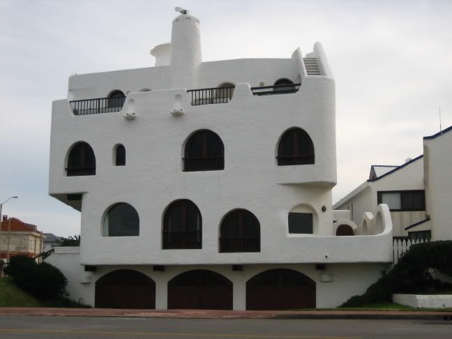 Le lendemain, moi et Vinsolente, on est aller voir de quoi avait l'air Punta del Este, gros resort tres touristique situé a 2h de Montevideo. Genre un mini Cote-d'Azure. Lers plage avait rien d'interessante mise a part quelques animaux semi enterrés dans le sable, dont un chien, des pingouins et des goelands. Au moins Vince a pu regarder ses premiers pingouins de vraiment pret!!! Les plages etaient aussi morte (lire innocupée) car il fait quand meme froid l'hiver et personne n'y habite. "La Punta" etait quand meme interessante, puisque c'est la ou les gens riche on construit leur maisons, maisons d'architecture fuckée,